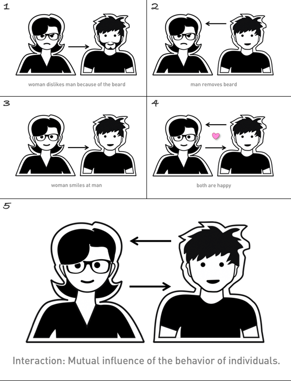 Interaction in its original meaning is the mutual influence of the behavior of individuals.