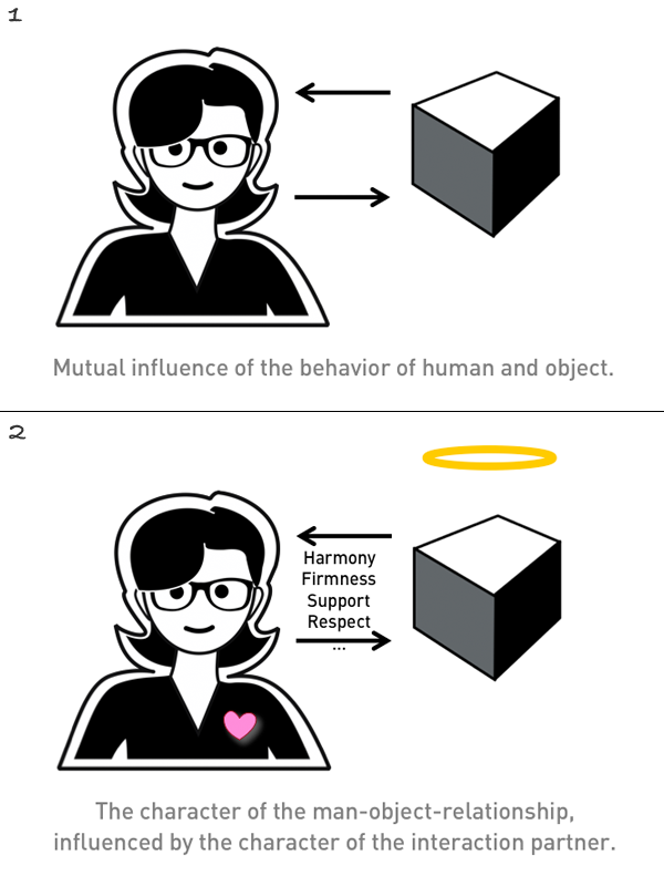 Under this conditions we can define the interaction between man and object as mutual influence of all interaction participants. This will automatically lead to an emotional link of the user towards the object, if any character attributes of the object become apparent.