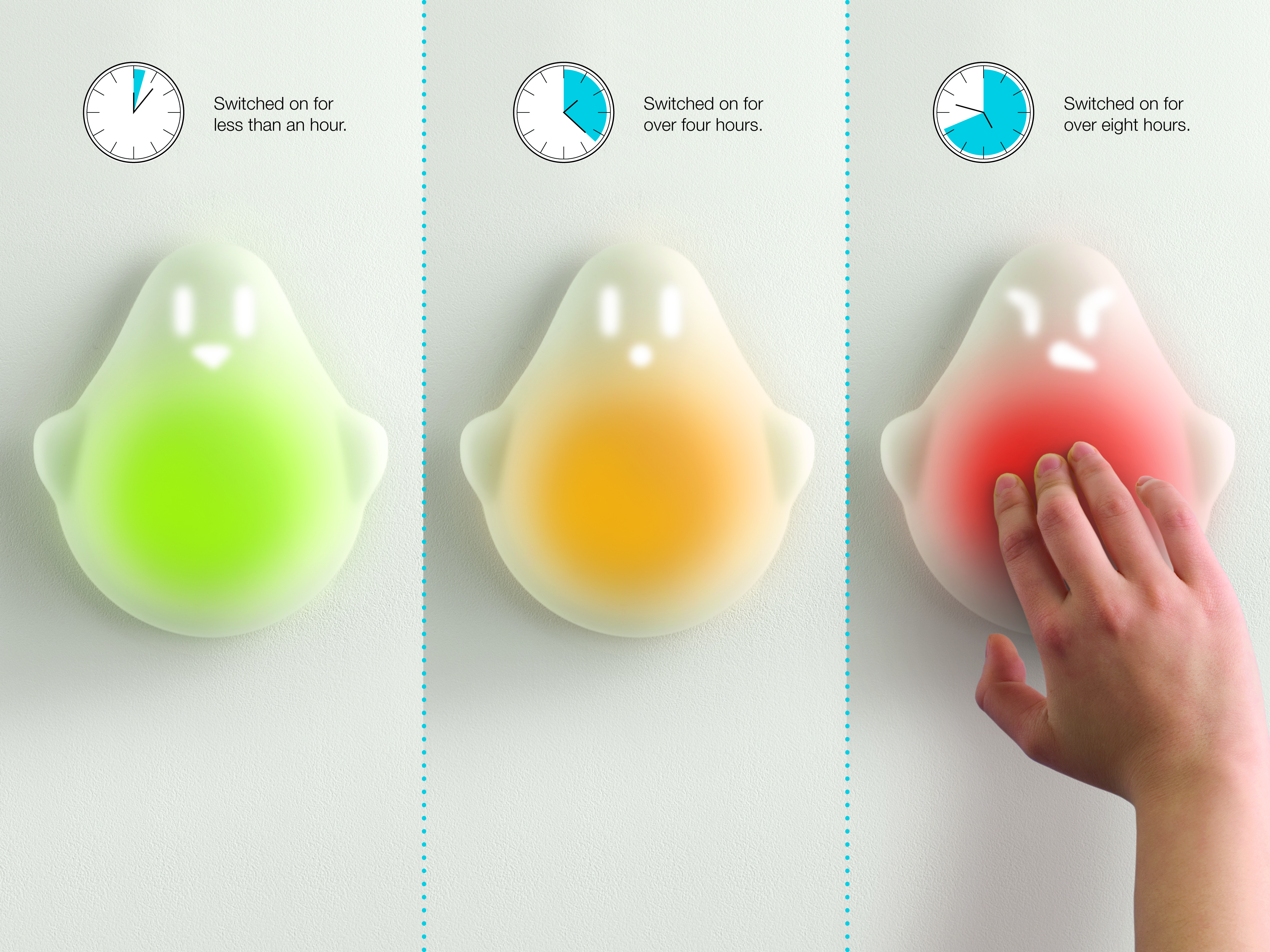 A more complex example for a character agent is Tio. The light switch system was designed by Tim Holley to increase the younger generation’s awareness of energy consumption. Tio enables children to demonstrate their knowledge of energy conservation to their families, while encouraging their role as ‘energy champions’ of the home. The system consist of light switches that react by a face feature on the light switch to the duration of lights are on. This display of emotion will encourage the child to turn off their lights when they are not needed, for example during the day, or when they are not in the room. A key feature of the concept is that it is a ‘product system’. The wall mounted light switch communicates with a computer to record the child’s lighting behaviour.